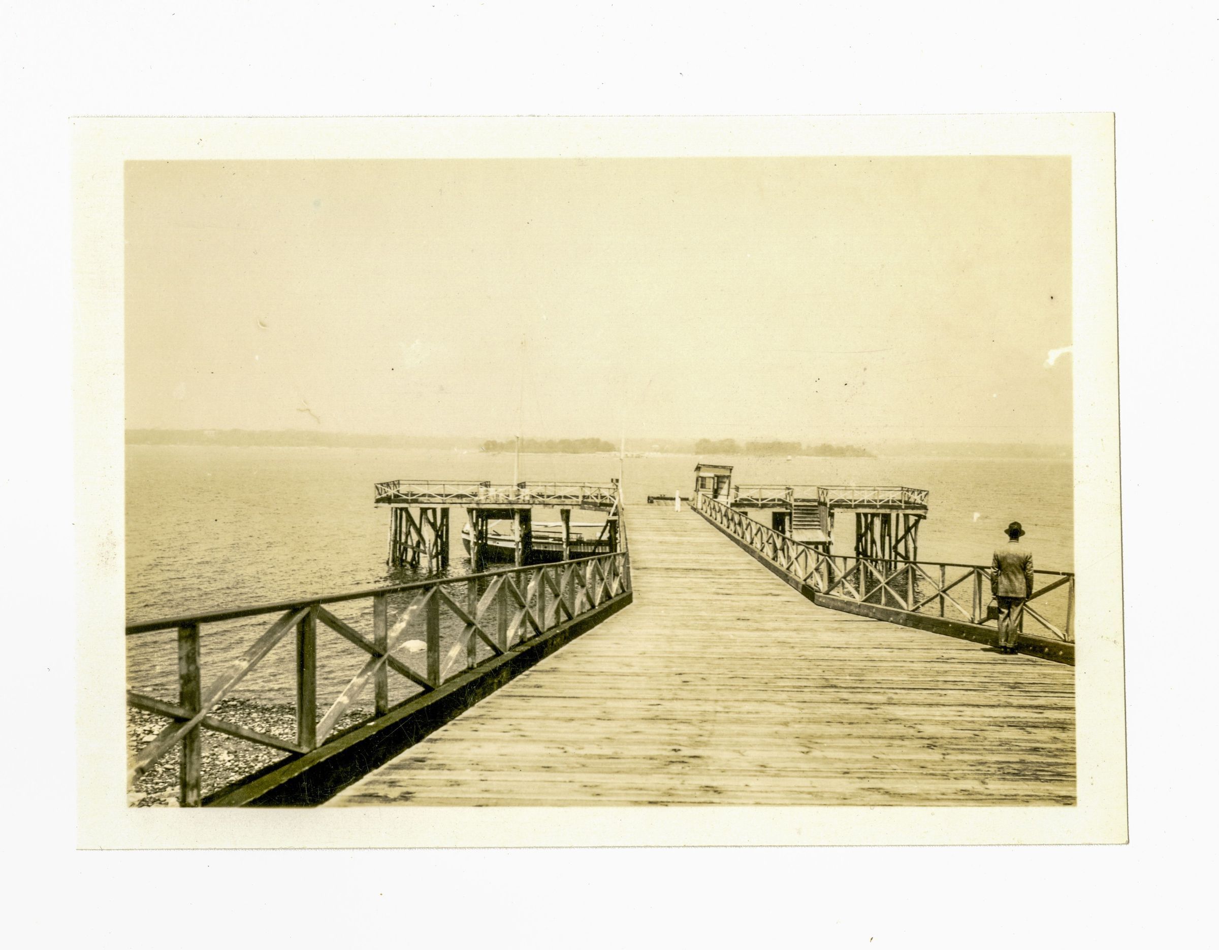 The boardwalk leading up to the clubhouse that stood on Great Captains Island. A man is walking on the boardwalk on the right of the image.Collection
