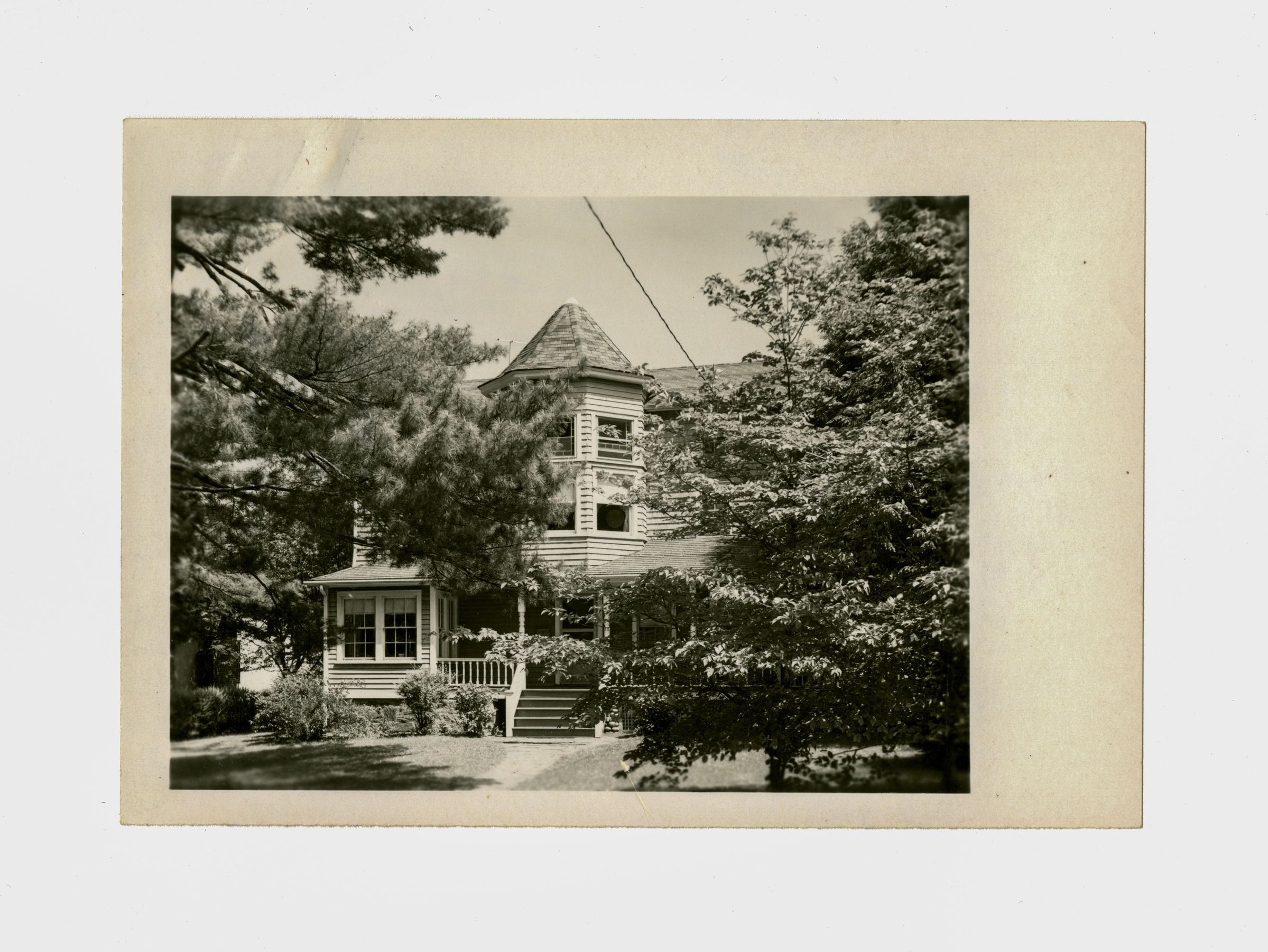 A partially tree-covered view of the front of the home with the porch and an octagonal 'tower' that sticks out of the house visible.Collection