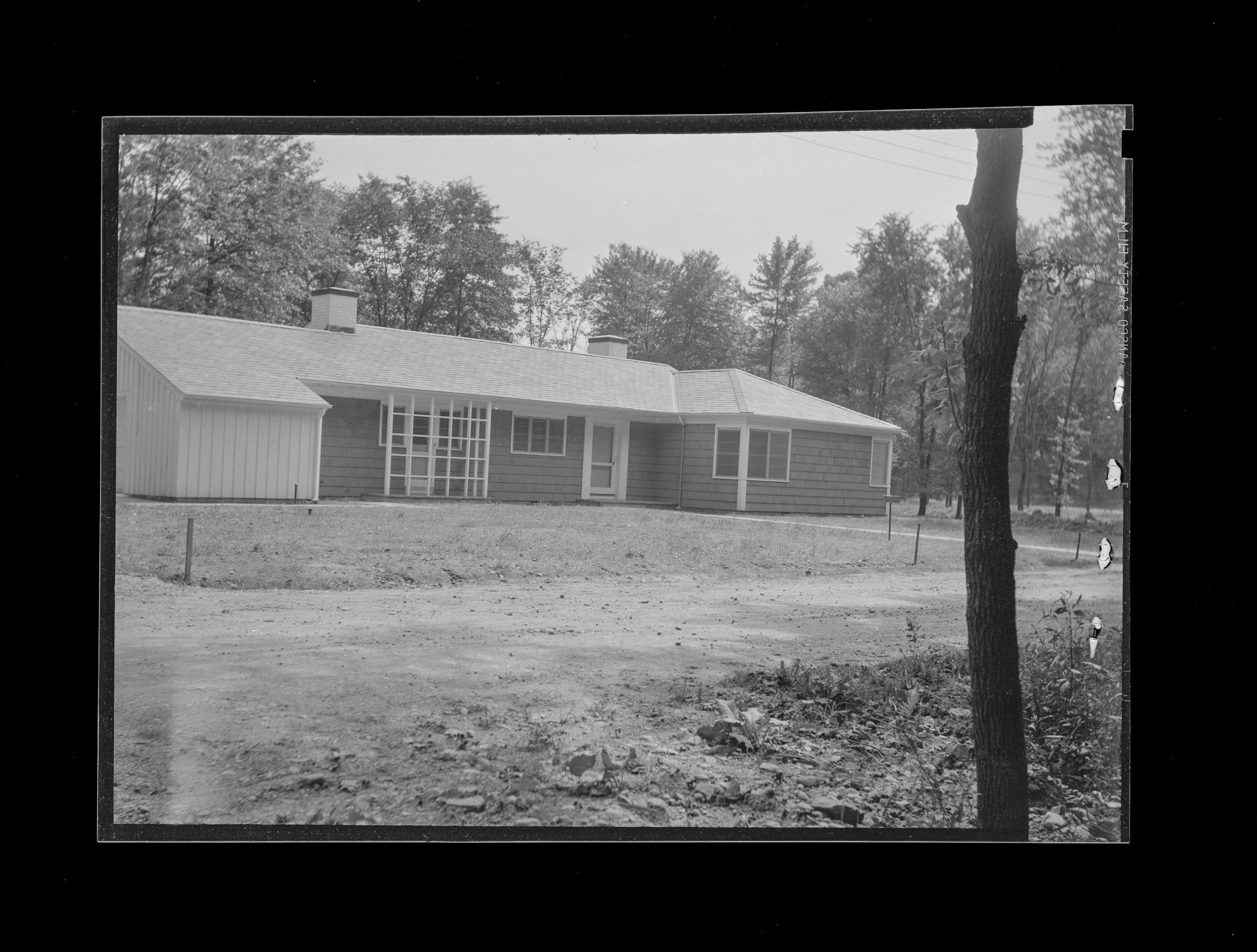 A single-story shingle home and dirt road in the foreground.