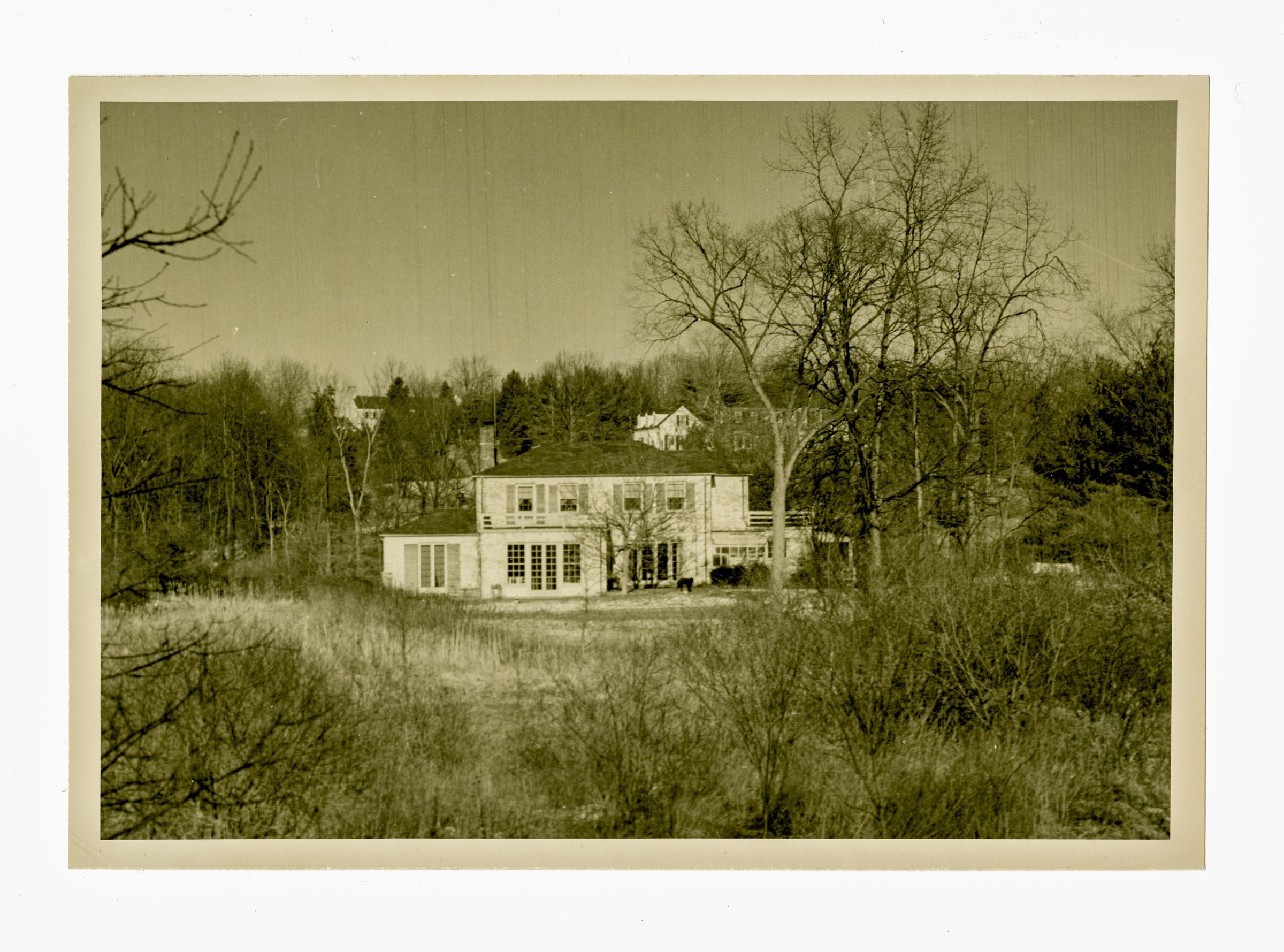 A view of a two story home in a brushy landscape. Other homes are pictured on higher ground in the background.Collection