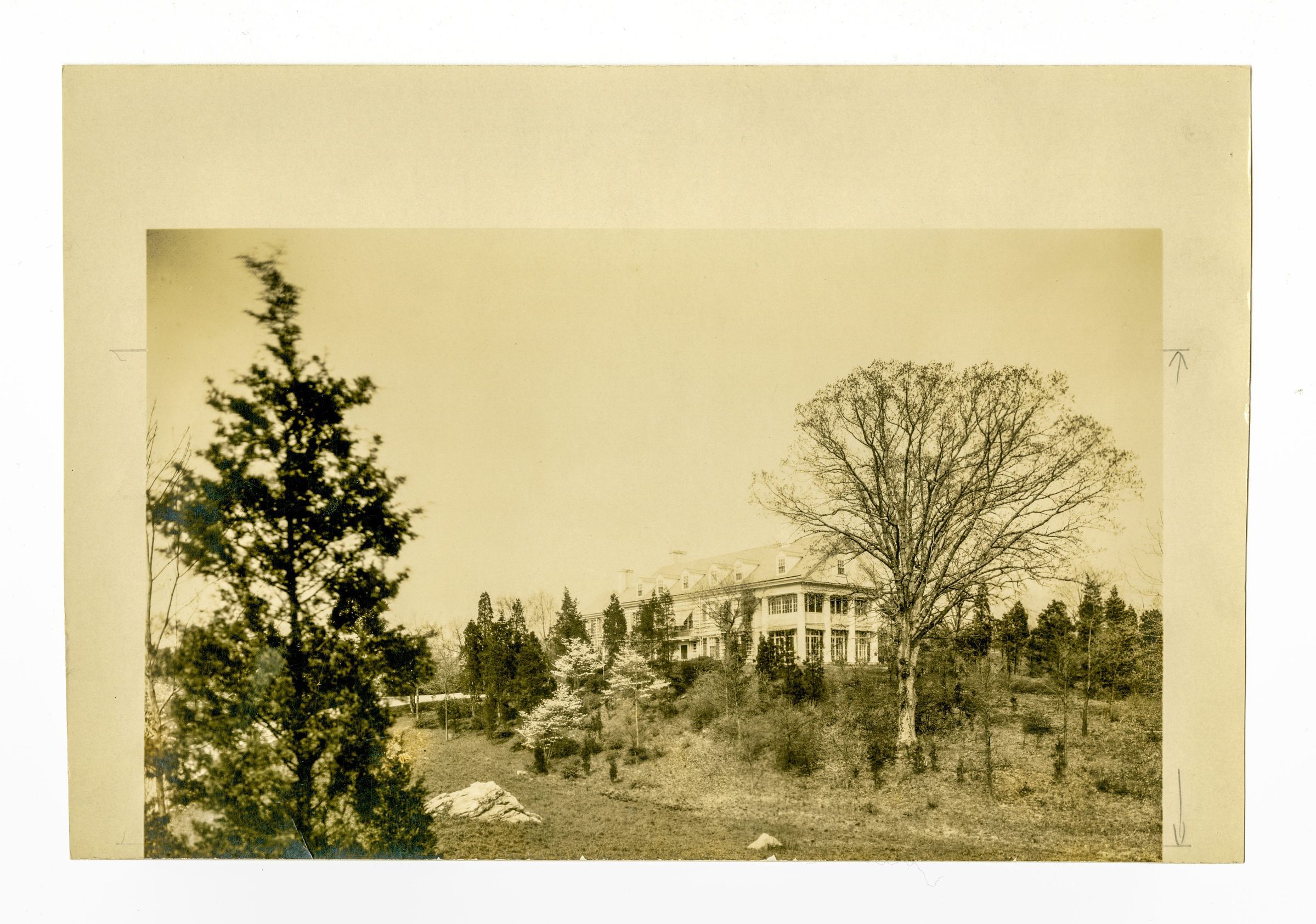 View of a large home on a small rise with many trees surrounding it.