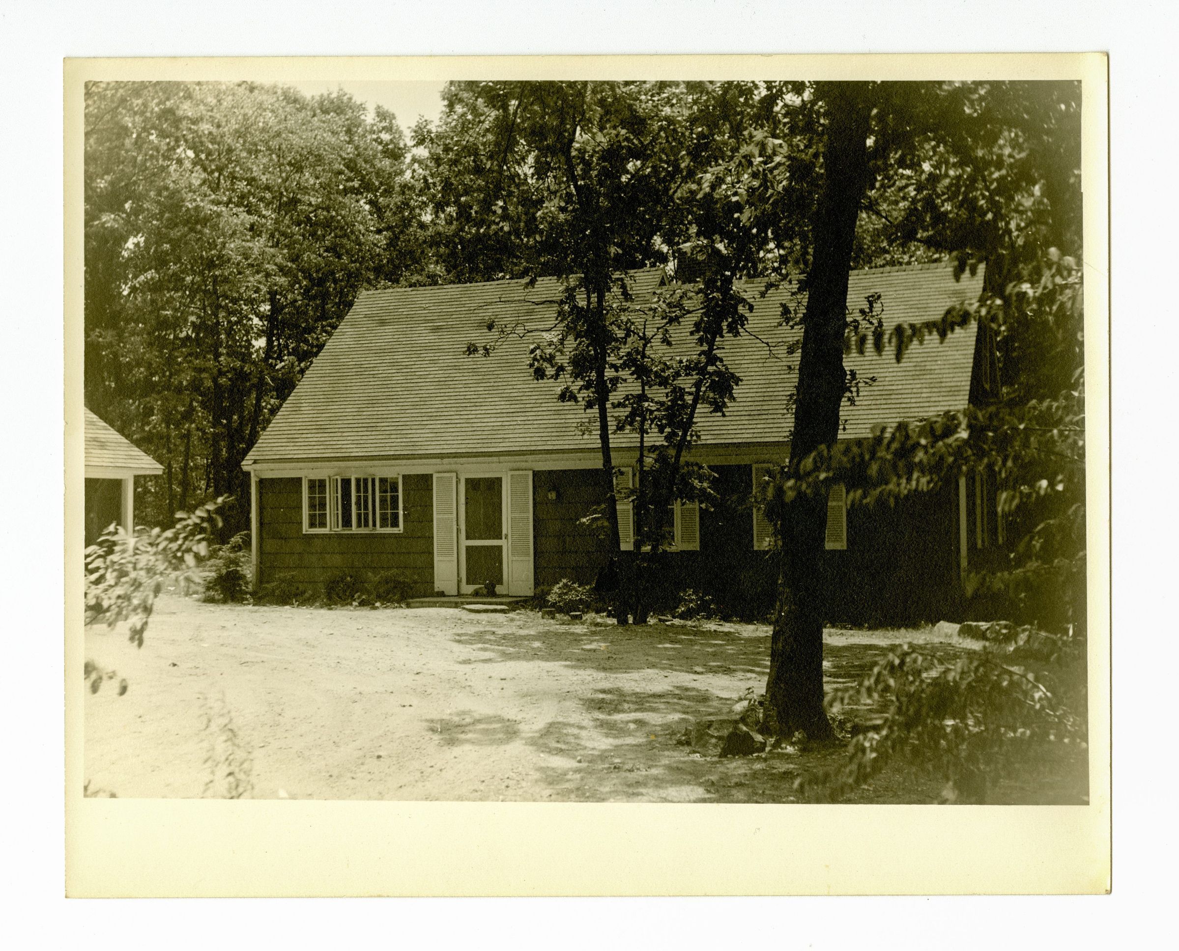A view of the entrance of the house, a dog is sitting in front of the door.