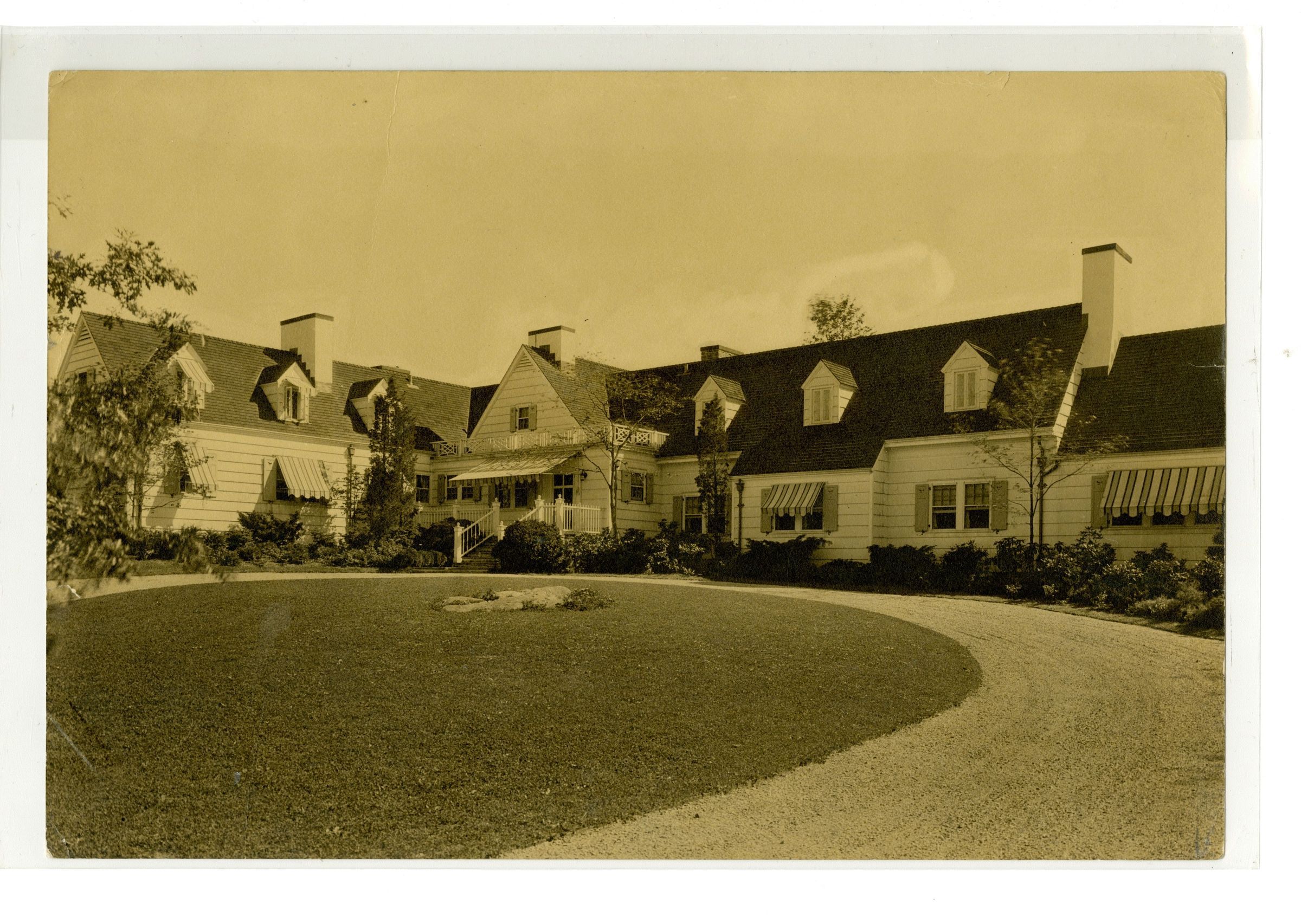 A view of a curving drive up to a clapboard home, a number of windows have awnings over them.Collection