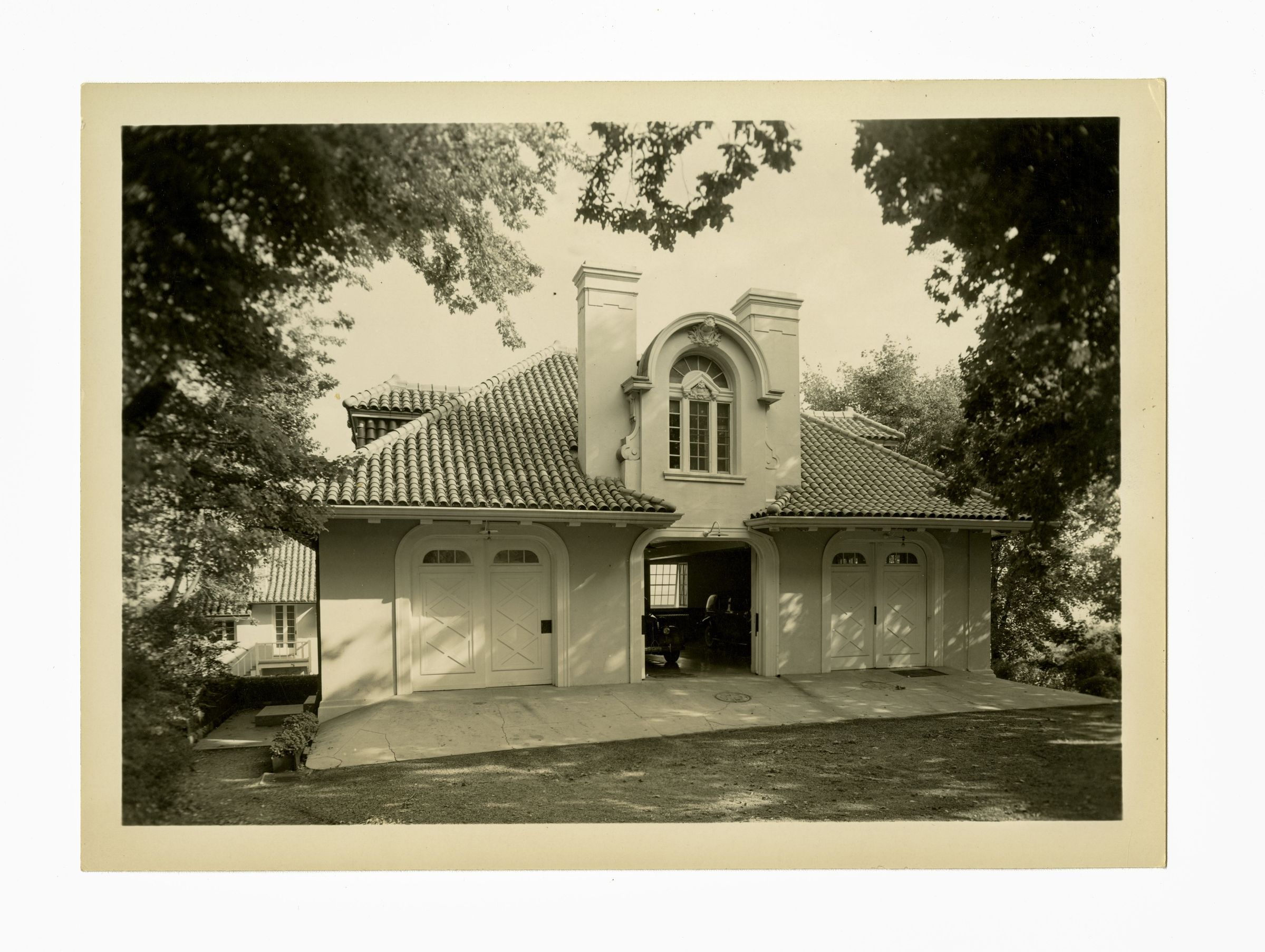A three-door garage with a tiled roof and a palladium window flanked by two chimneys at the front, potentially a window used by people living in the upper floor of the garage.Collection
