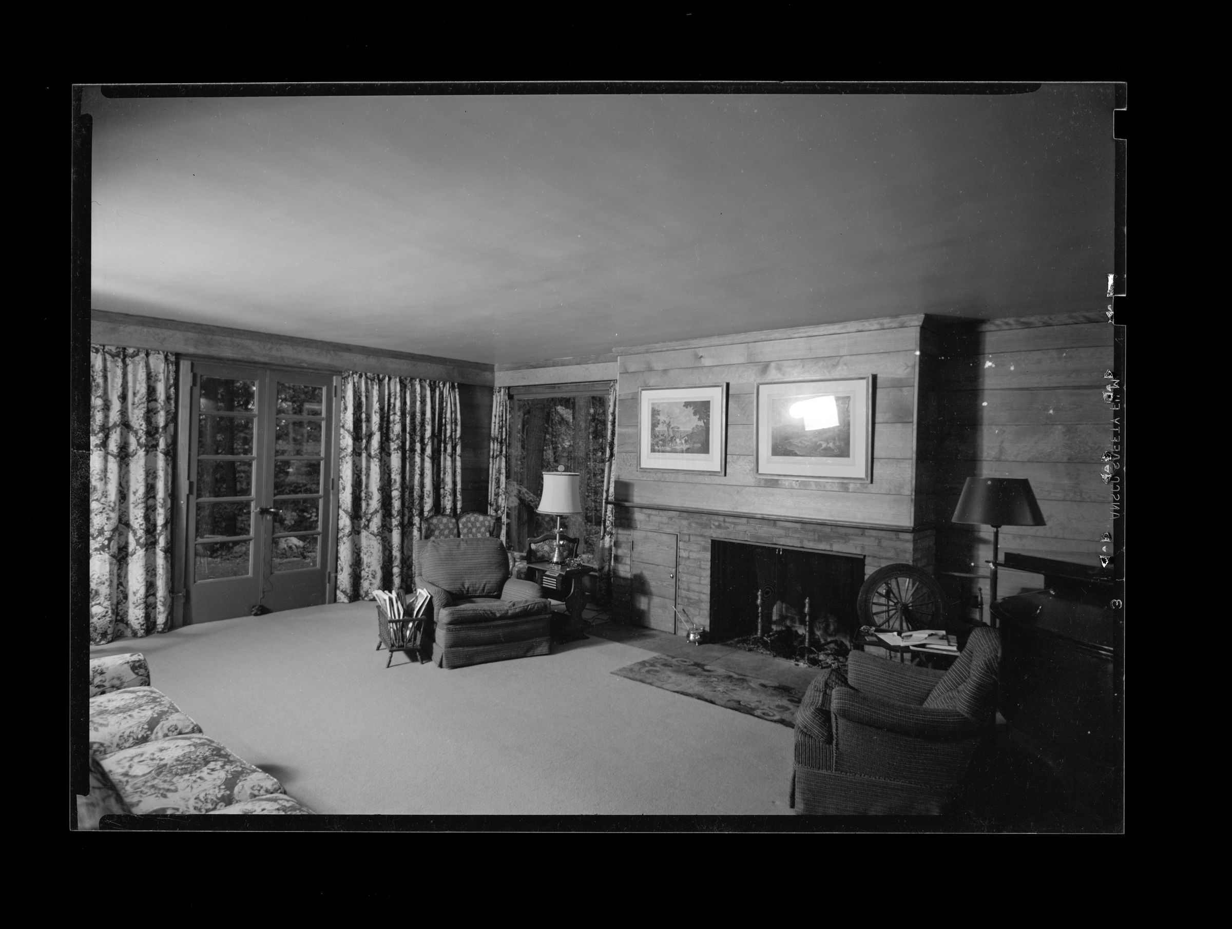 A wood-paneled room with a fireplace, a wall sized window is on the left of the image with trees and part of the lawn visible.Collection