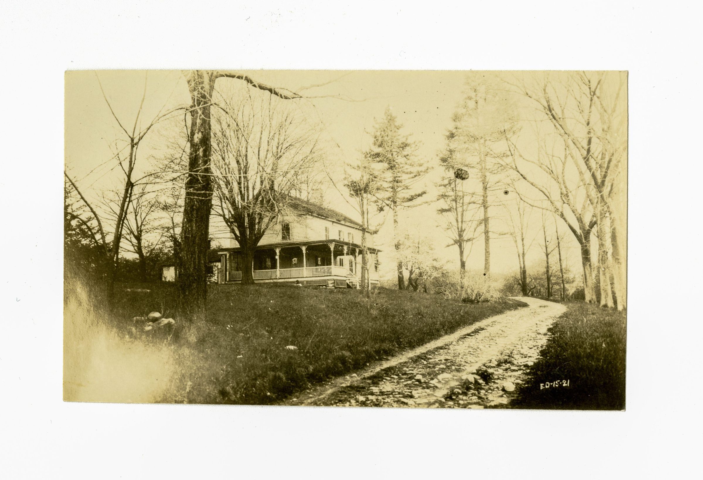 A view of the house from the approach. The house is two stories and has a covered porch.