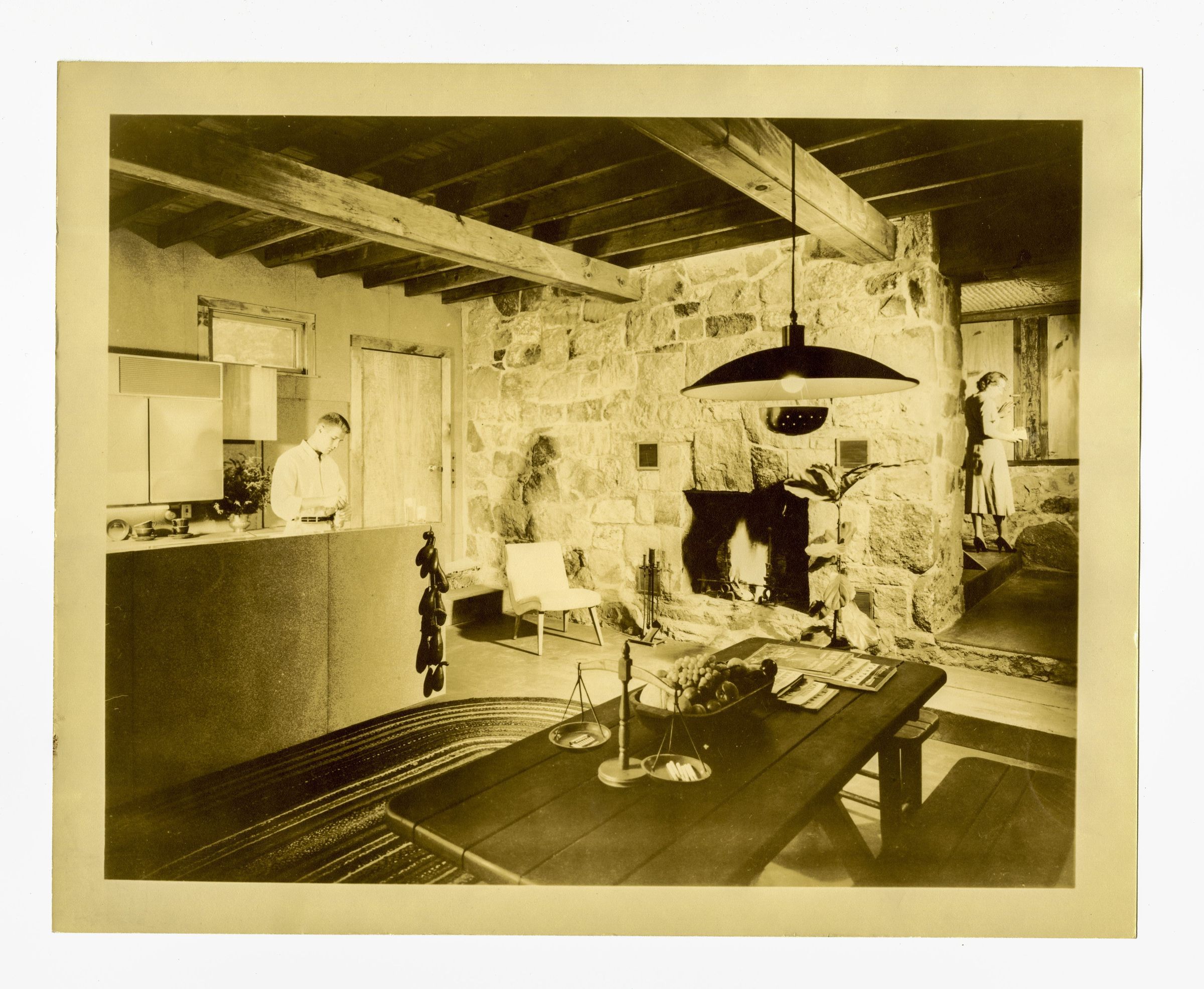 The kitchen of a home with exposed beams, a stone wall and fireplace. A man is at the kitchen counter opening a bottle. In the foreground is a dining table with a hanging lamp hanging over it.Collection