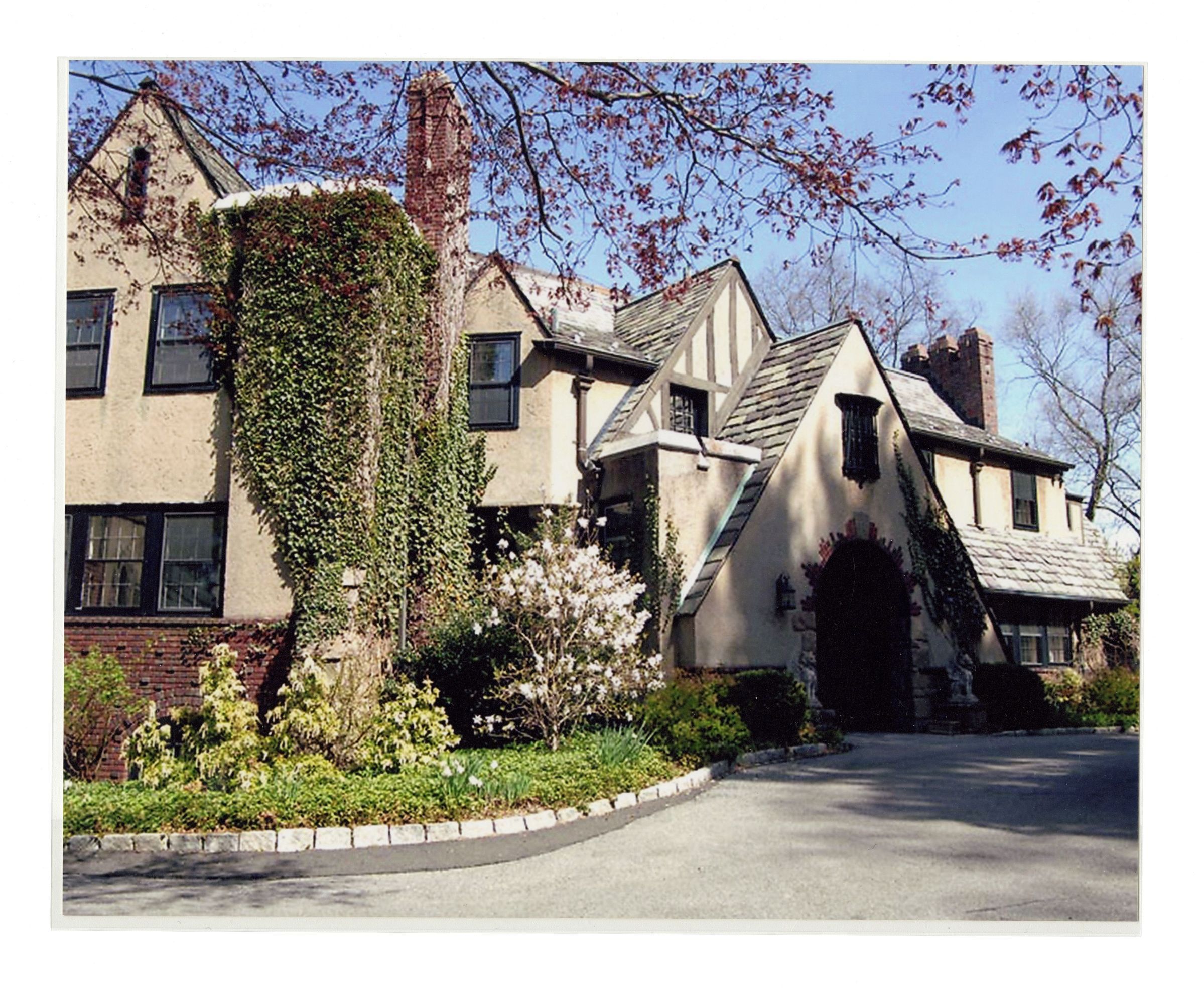 View of the house from the drive. The house is built in the English Tudor style with a slate roof. The house is partially covered in ivy.Collection