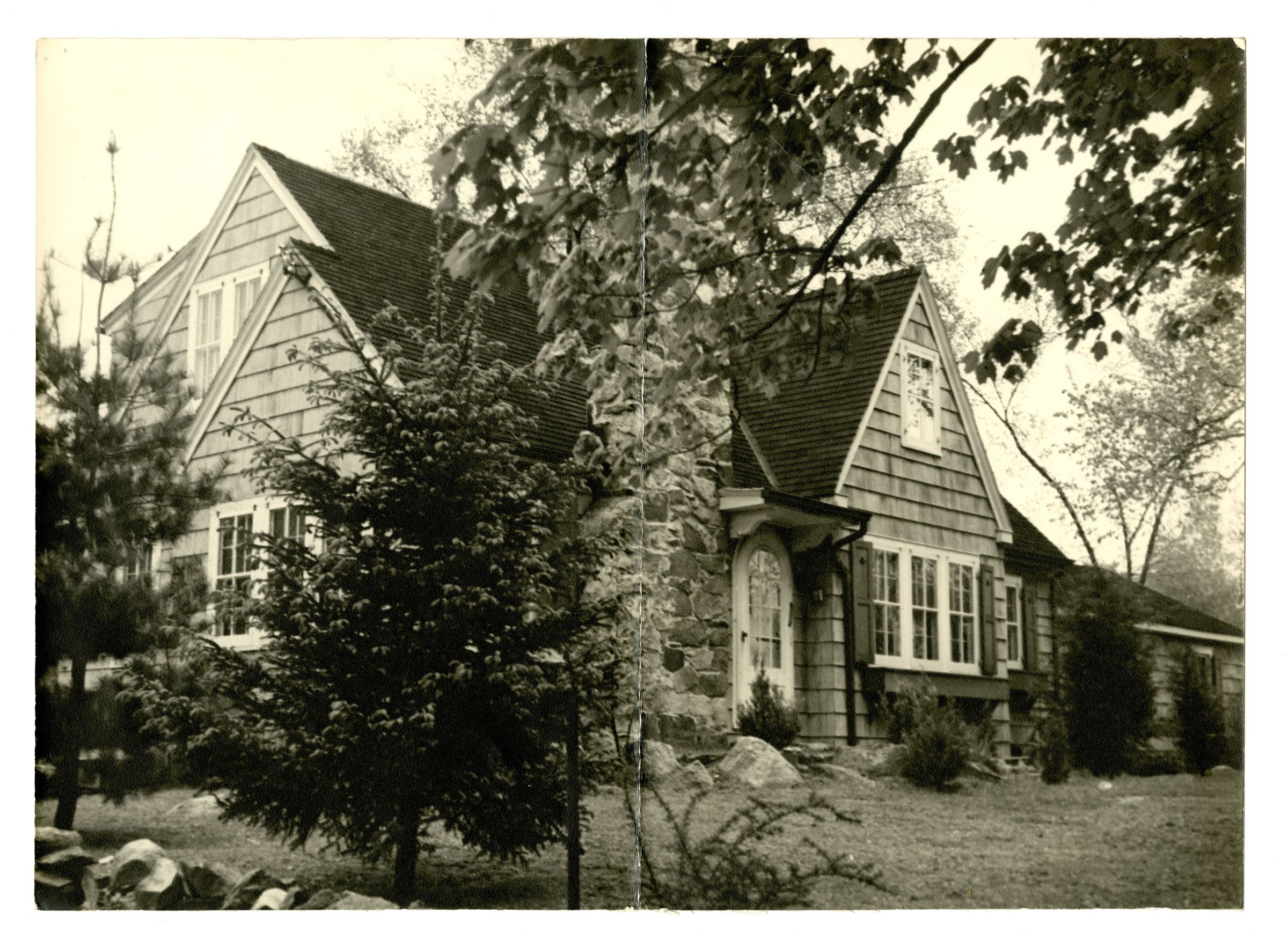 A shingled home with a stone chimney.