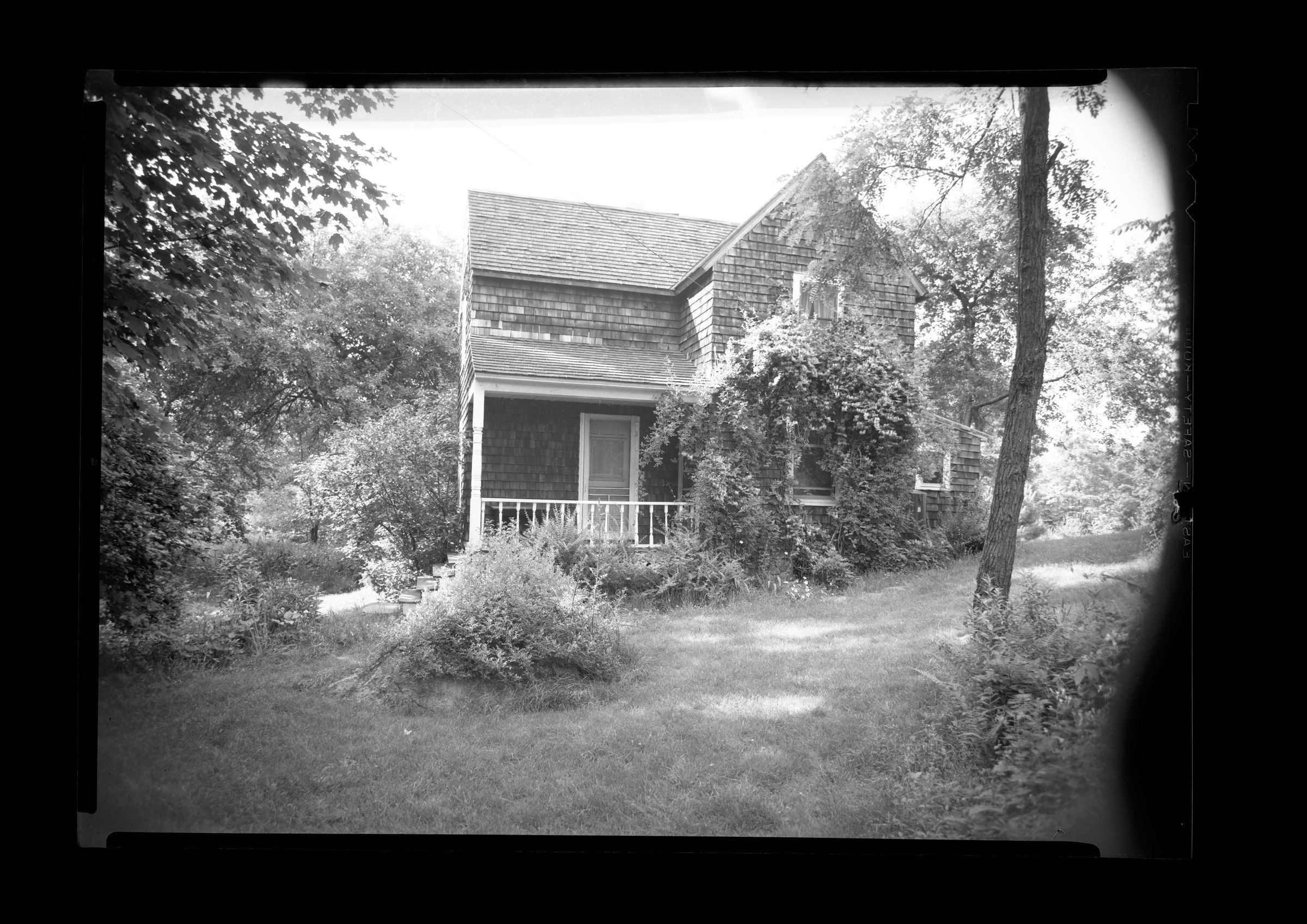 View of the home and porch. Home is shingled and has ivy growing up a wall.