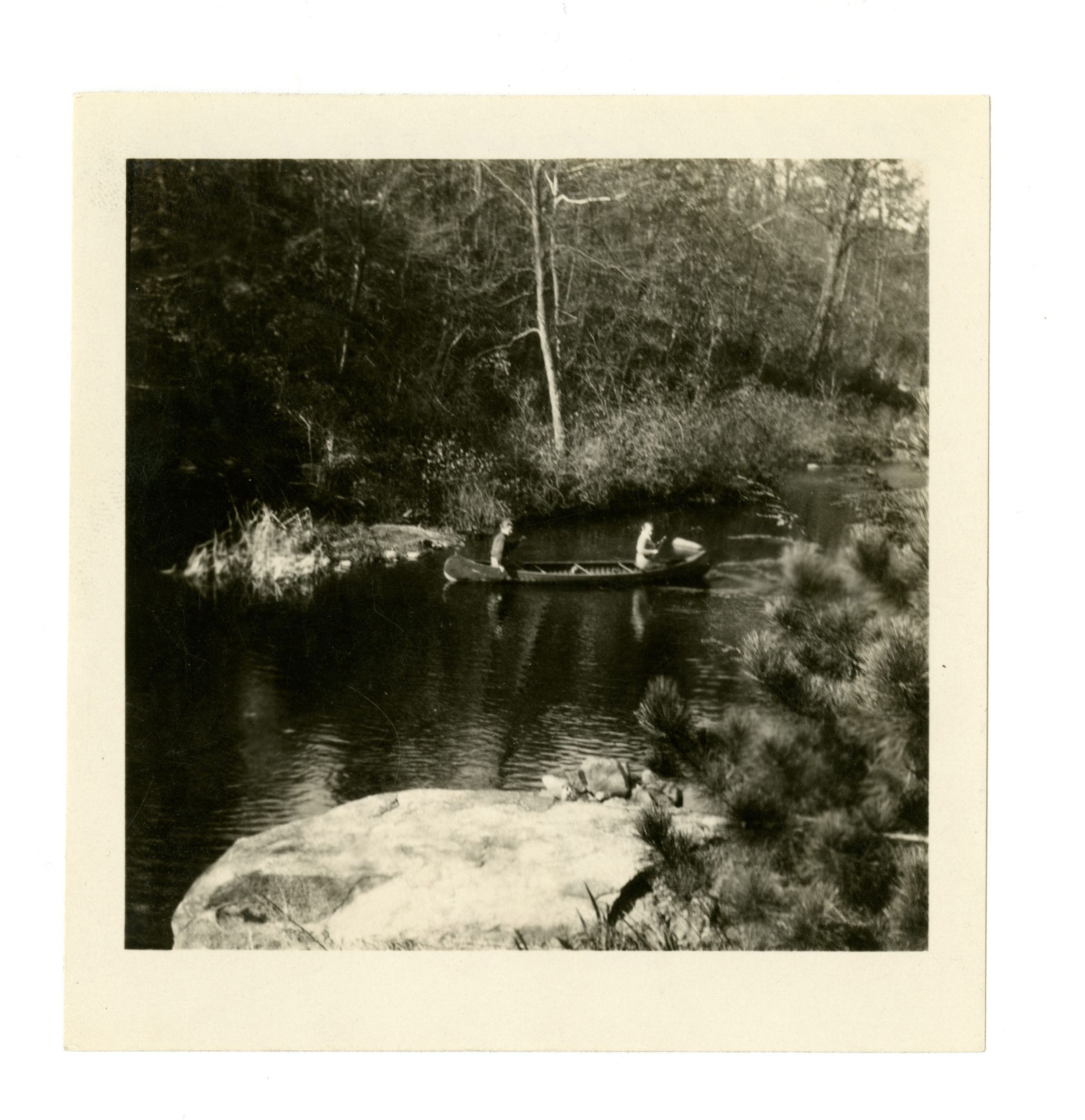 Two people in a canoe on a tree-lined stream.