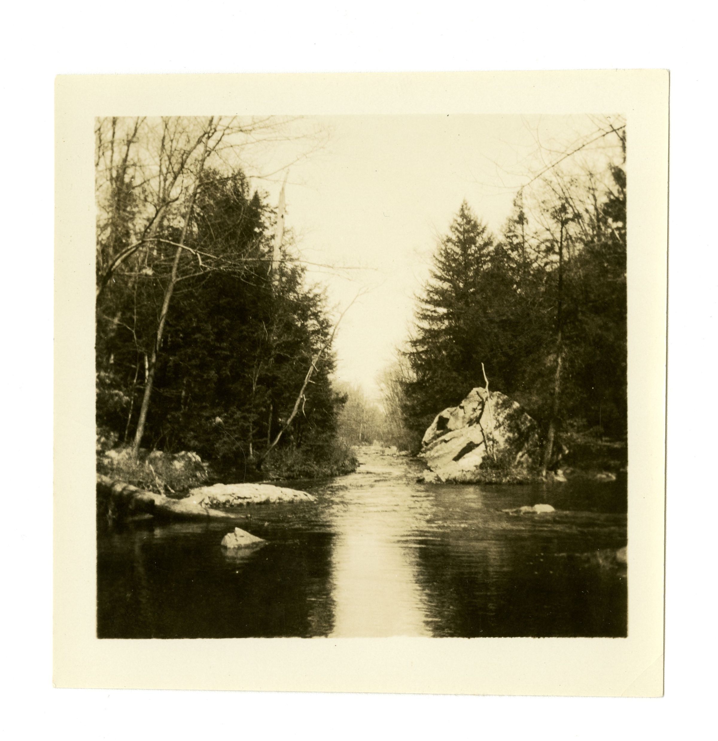 A tree-lined stream with large rocks on either bank.