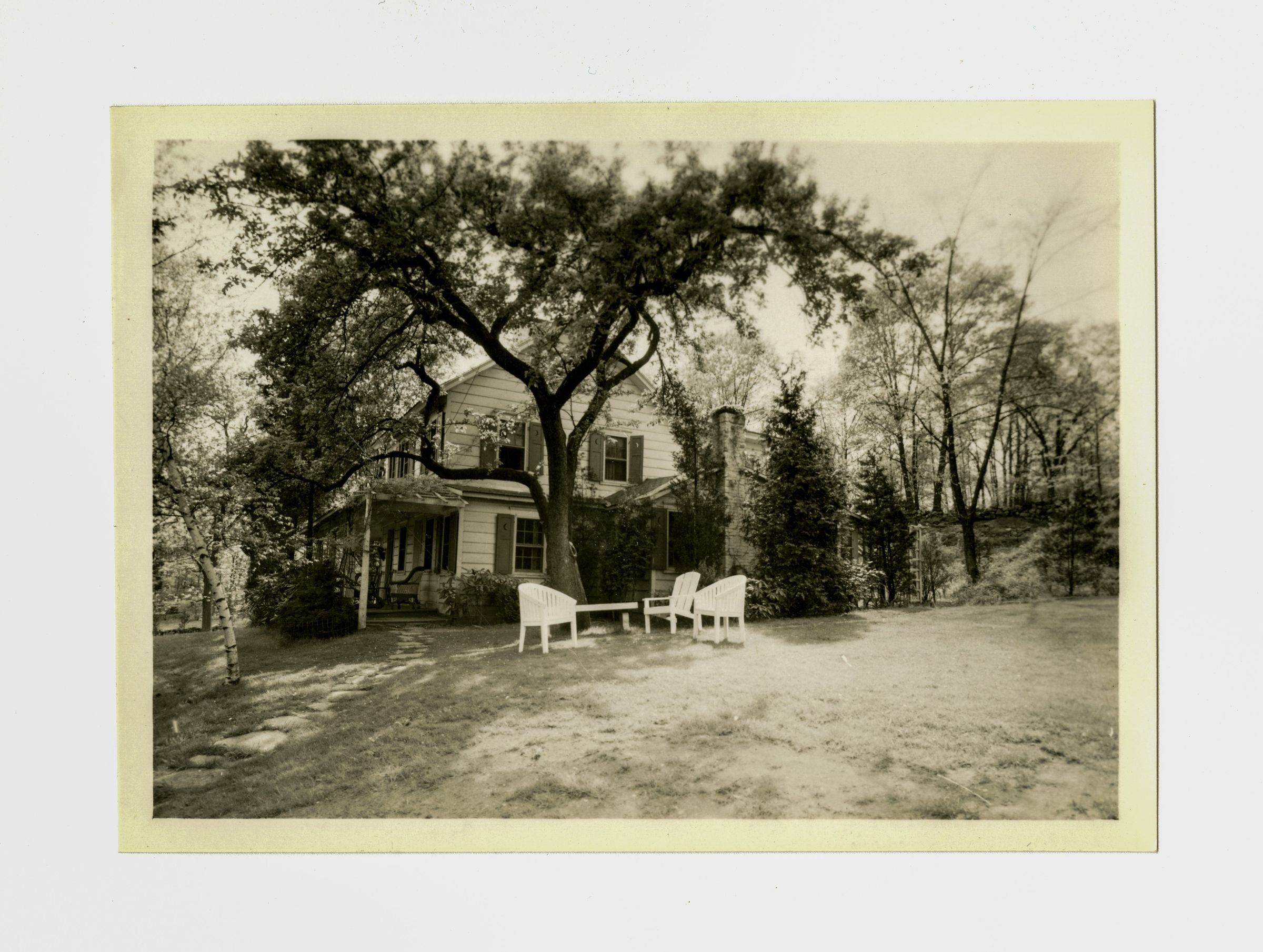 View of the main house looking South-West. The home is clapboard sided with a covered porch on the left of the picture. There are many trees and bushes growing around the perimeter of the home.Collection