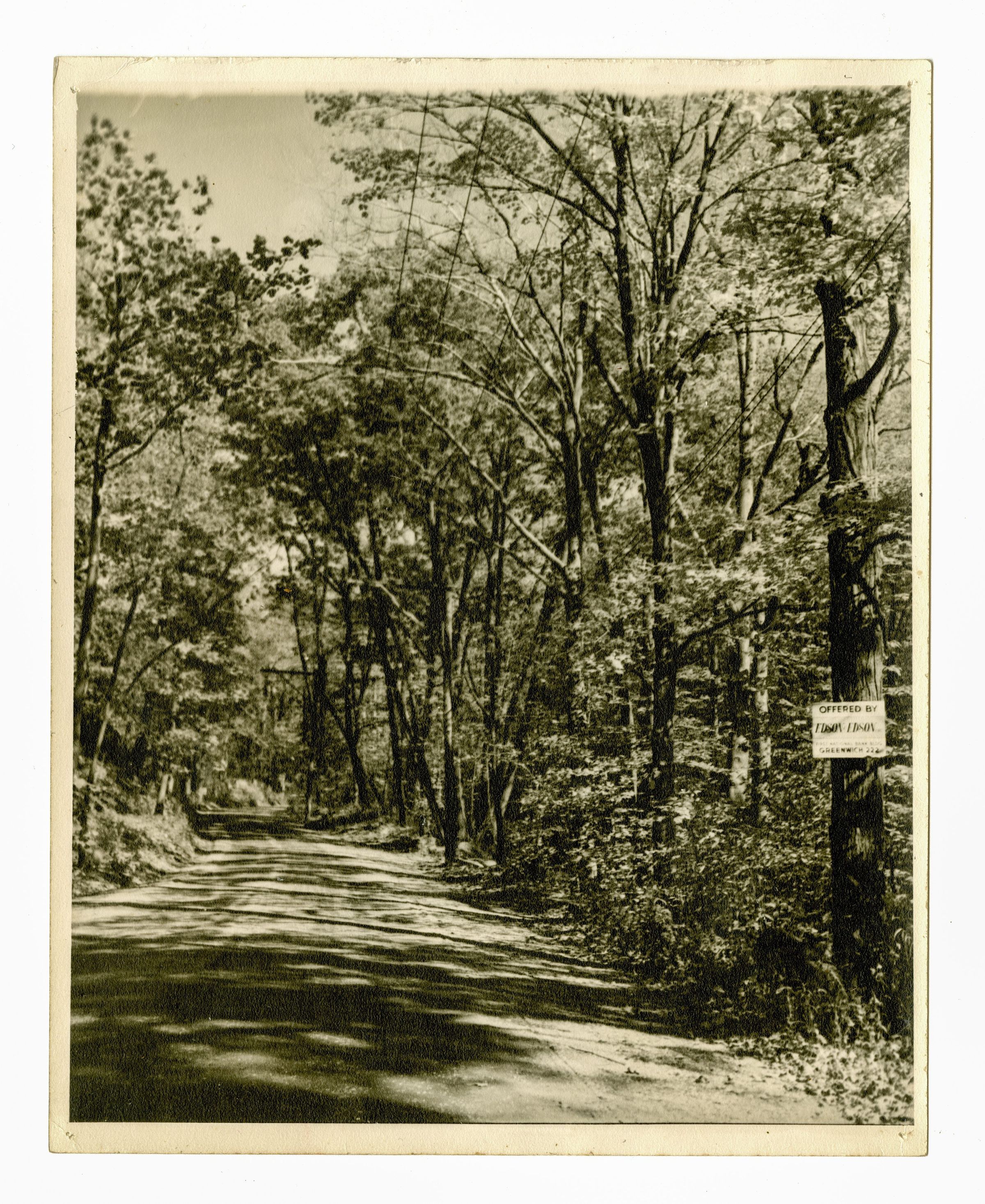 A tree-lined road. A sign on the right of the picture indicates that the property is for sale through Edson & Edson.Collection