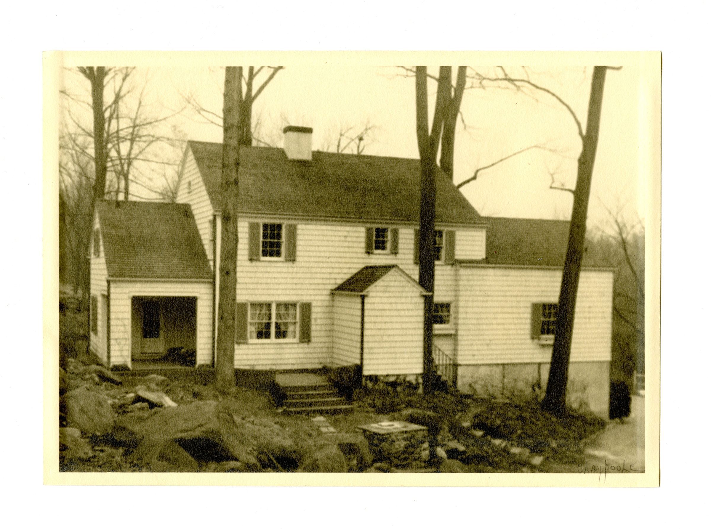 View of the house from the back. The center of the home is white-painted brick, the wings are clapboard.