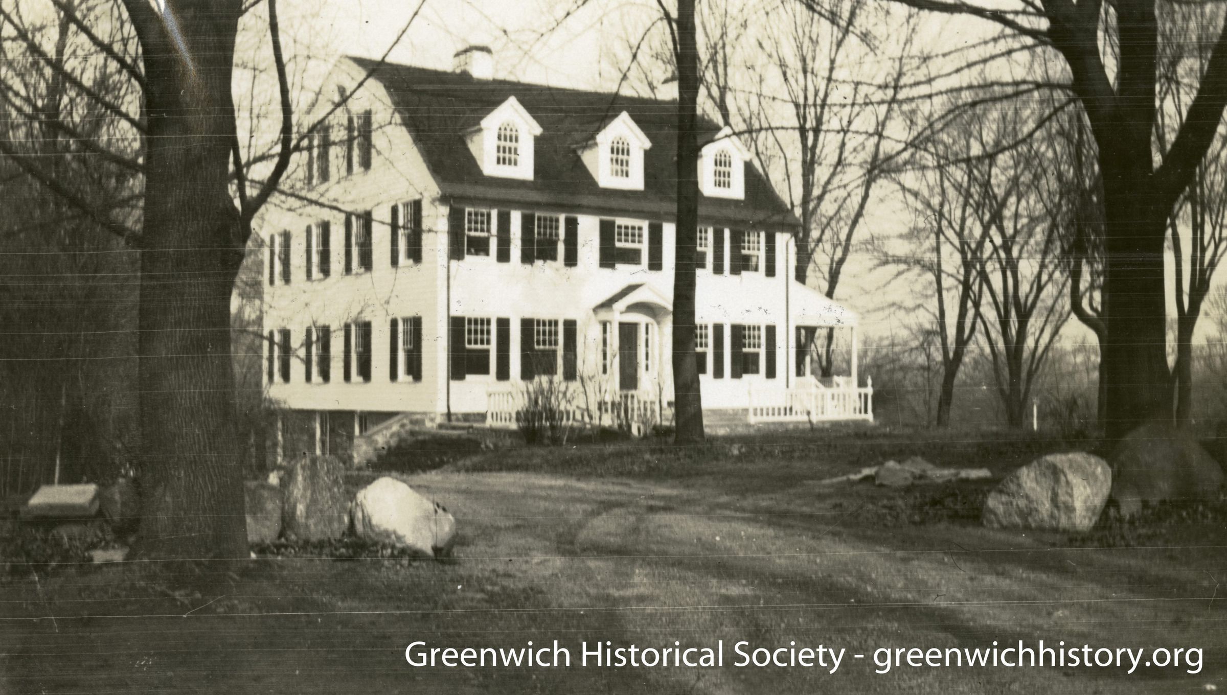 Angled view of the white house from across the street. The house has three dormers and a covered side porch is visible on the distant side. Four boulders are scattered along the road.