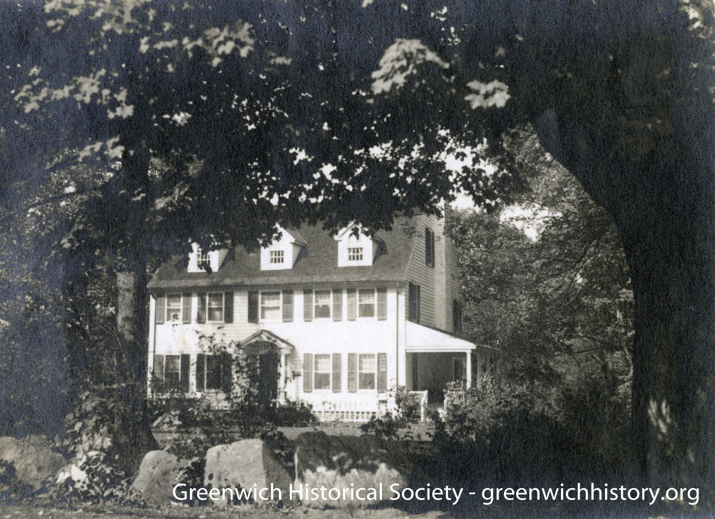 View of the front of the house partially obscured by a large tree and a stone wall.