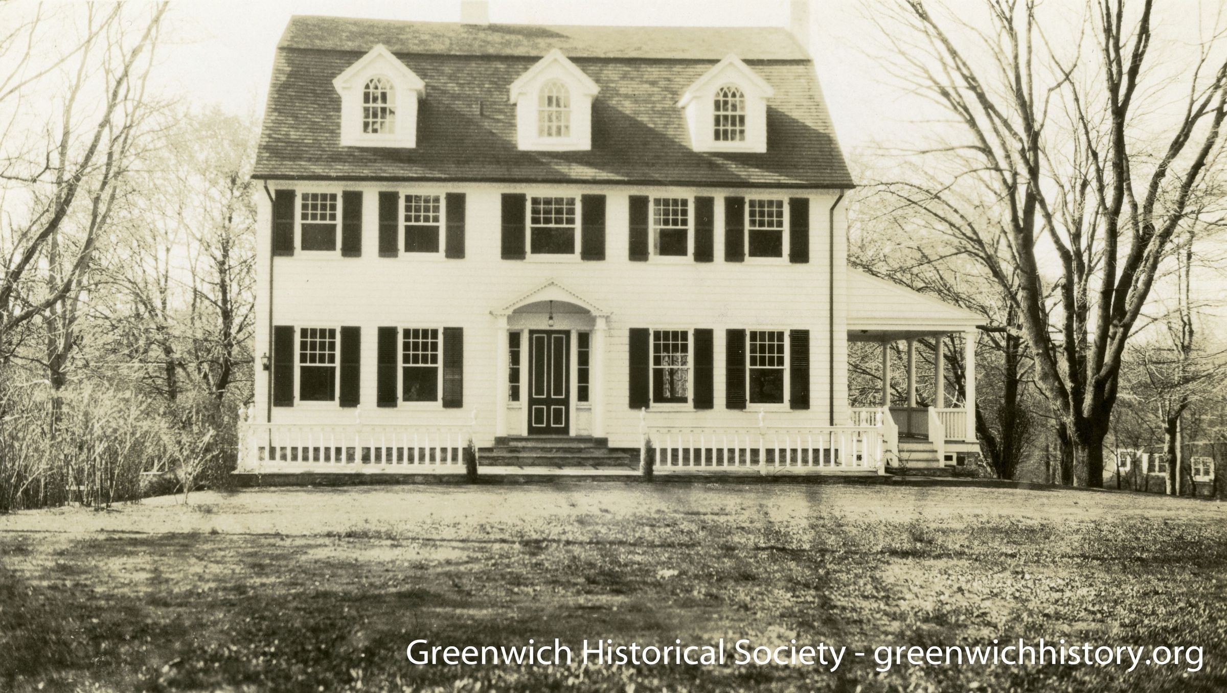 Front view of a white house with three dormers and a covered side porch. There is a white picket fence in front of the house.