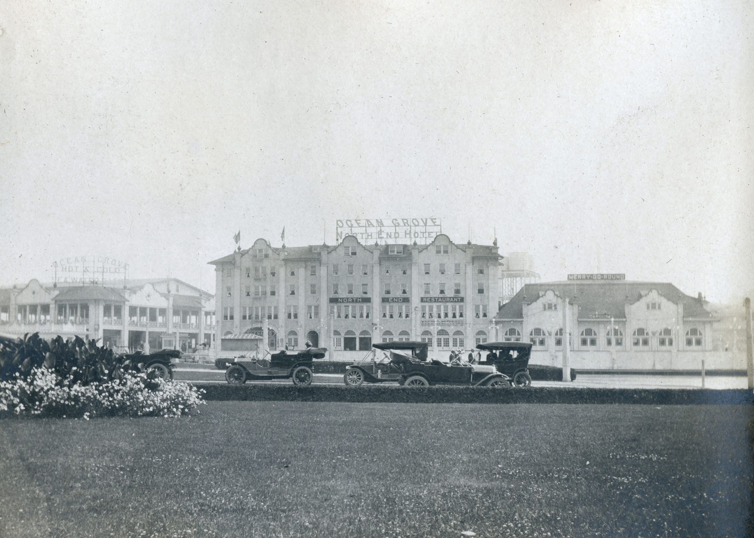Automobiles lined up in front of the Ocean Grove North End Motel, likely on Jersey Shore.Collection