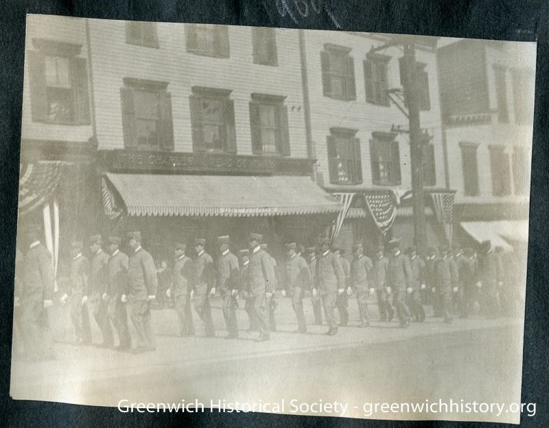 Parade of men dressed in uniform, likely on Greenwich Avenue