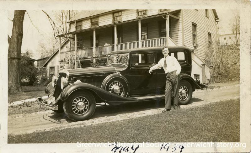 Man standing by automobile in front of home of Betsy Dorsey with Glenville Epscopal Church on left.