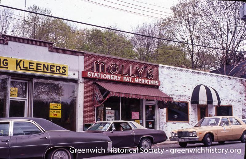 Molly's Stationery at 267 Glenville Road, with King Cleaners to left and Morgan's Restaurant to right, May 1978