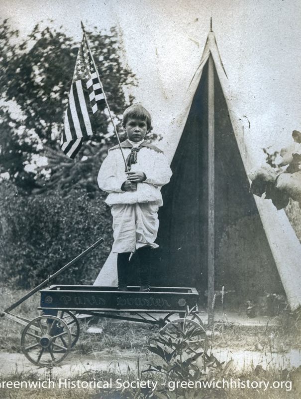 Young boy standing beside tent with toy Paris Coaster wagon, location unknown.