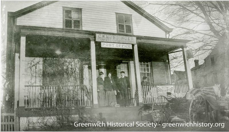 A two story store house with a full-width, one-story porch and a store sign hanging from the top of the porch. There are four people standing on the porch. Parked outside of the store is a horse-drawn carriage. The building today is called the Justus Luke Bush Storehouse and is the offices of the Greenwich Historical Society.Collection