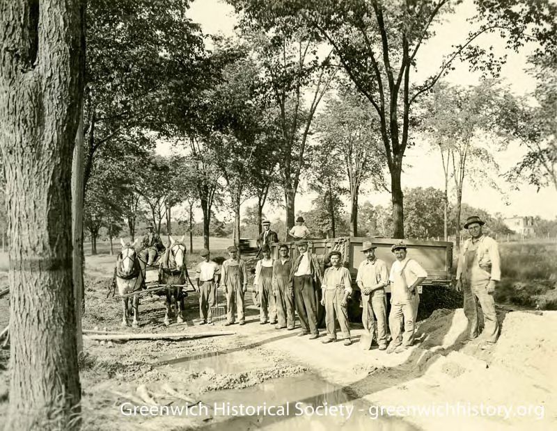 Laborers, likely working at the Putnam Manor development (off of East Putnam Avenue, bounded by Park Place and Old Church Road). There is a horse drawn carriage and the bed of a truck behind the workers. One worker is holding a pitch fork.Collection
