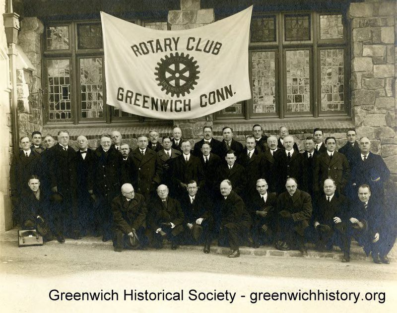 Group photo of the members in the Rotary Club. They are standing in front of a stone building with a banner hanging above them. The banner reads "Rotary Club Greenwich Conn." and in the wheel it says "Rotary International." The members are wearing black buttoned up jackets and suits.Collection