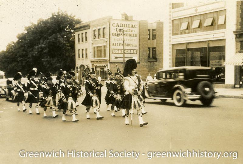 A parade on Greenwich Avenue by Allen Bros billboard. A group of Scottish men march wearing kilts and holding bagpipes. There are Ford Model A cars next to and behind the men marching. A billboard, in the background, reads "Cadillac La Salle Olds Mobile Allen Bros Used Cars."Collection
