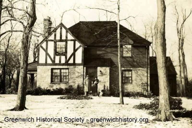 A two story home with brick, stone, and wood siding. It has decorative half-timbering, a gable and a moderate hipped roof. In the foreground, there is a man and a woman with two dogs standing in the snow.Collection