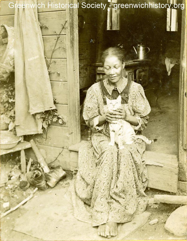 An African-American woman sitting on a wooden doorstep holding a cat. She is wearing a paisley dress with her hair pulled back. Behind her is a stove with a tea kettle on it. Woman was possibly the wife or relative of John Ambrose. John Ambrose worked as a farm laborer (according to 1900 census) for Isaac Ferris on property were Riverside Commons shopping center is today.Collection