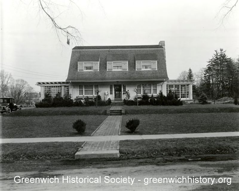 Two story home with three shed dormers and side lights surrounding the front door. There is a porch made of all windows attached to either side of the home. A Model A Ford is parked in the driveway.Collection