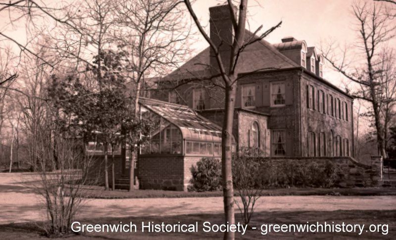 Side view of 69 Vineyard Lane. Two story home with a greenhouse, a stone facade, and an exterior brick chimney. There are shutters and three dormers, two with an arched top and one with a gabled roof.Collection
