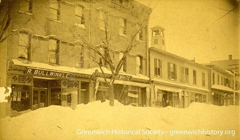 Greenwich Avenue on Wednesday following the Sunday night blizzard in March. There are large piles of snow in the streets in front of the storefronts. Two storefronts in particular are R. Bullwinkle and R. White. Two men stand under an awning to the right of R. White.Collection