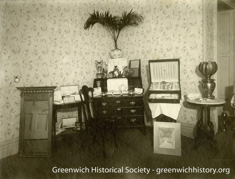 A room with four wooden tables and flower wallpaper. The center table has three sets of drawers and a desk-like top. There is a plant, a tea pot set, and other glass containers found on this table. In front of this elaborate table or desk is a wooden chair. Located on the other tables are many opened boxes full of dining utensils. There is a mirror and picture on the ground.Collection