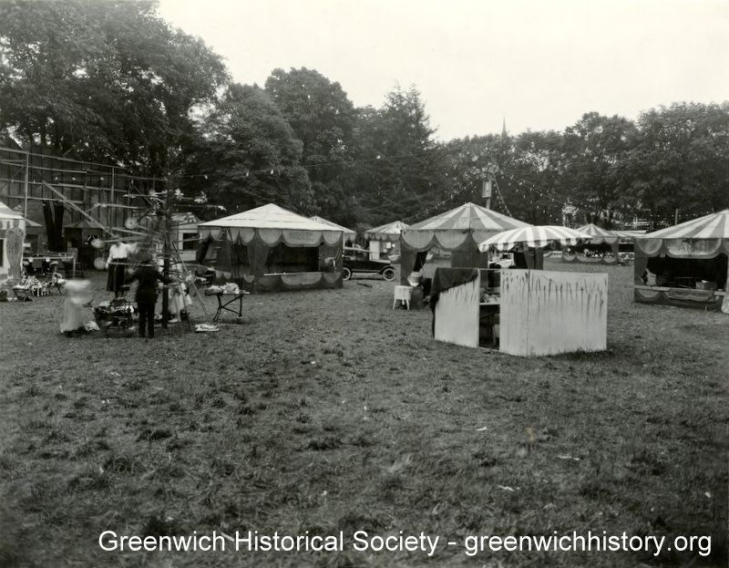 View with church in the background. A fair with many tents, lights strung, and cars parked on the lawn. There are two people to the left setting up a piece of equipment for the fair. This fair takes place at the northeast corner of East Putnam Avenue and Park Avenue. Spire of Second Congregational Church is visible in background. A portion of The Columns (181 East Putnam Avenue) is just visible through the trees in the background at right.Collection