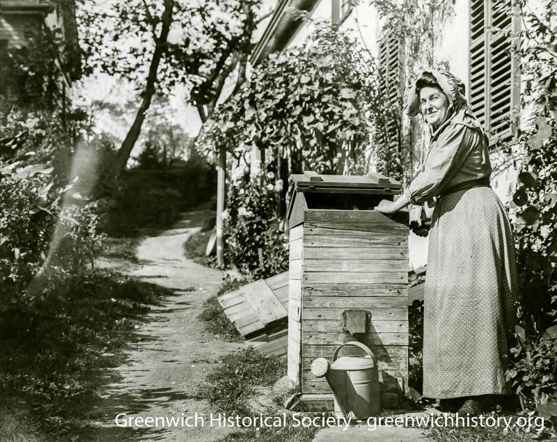 Mary Munsinger standing on south side of C. W. Munsinger store and post office. There is a watering can in front of Munsinger and a wooden container for either food or water. Just behind Munsinger are wooden cellar doors. The building today is called the Justus Luke Bush Storehouse and is the offices of the Greenwich Historical Society.Collection