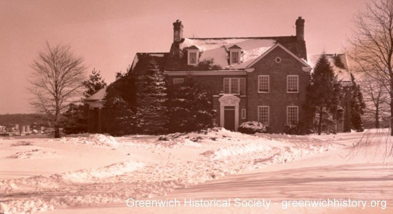 Front view of Capenor Broad Road. Two story home with a segmental pediment above the door, two gabled dormers, and two interor-side brick chimneys. There is snow on the ground.Collection