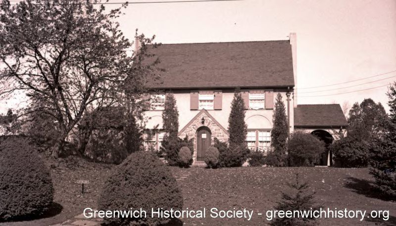Two story home with shutters and an oriel above the front entrance. It has a stone and stucco facade with a side-gable, high pitched roof.Collection