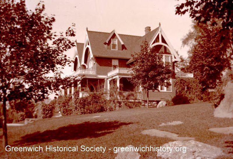 Possibly 5 Hillside Drive, near corner of Lake Avenue. Two story home with one dormer and decorated verge boards. It has a porch along the first story and second story. The home appears to have been extensively remodeled between the time of this image and the later 1929 and 1937 images. Referred to as "The Corner," also may have been referred to as Rocklawn.Collection