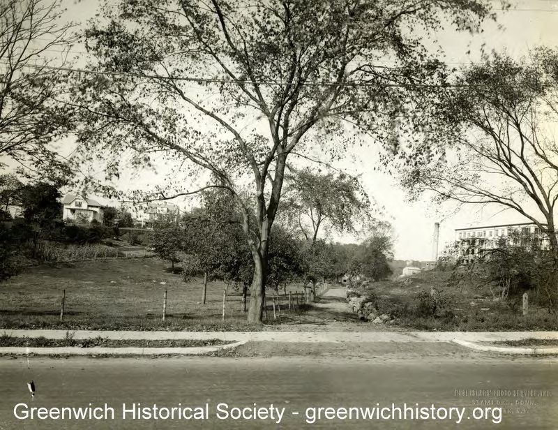 A dirt road in the center with houses on the left. Houses at left are on Prospect Drive. On the right of the dirt road is a large building and smokestacks.Collection