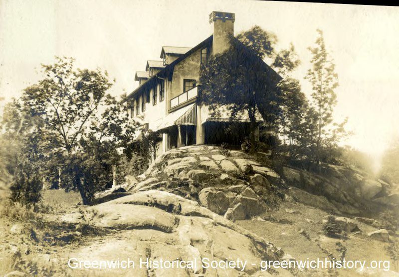 A close up, side view of the house on Glenville and Brookside Drive. A two story home with shutters, gabled dormers, awnings, and an exterior chimney. There are many rocks.Collection