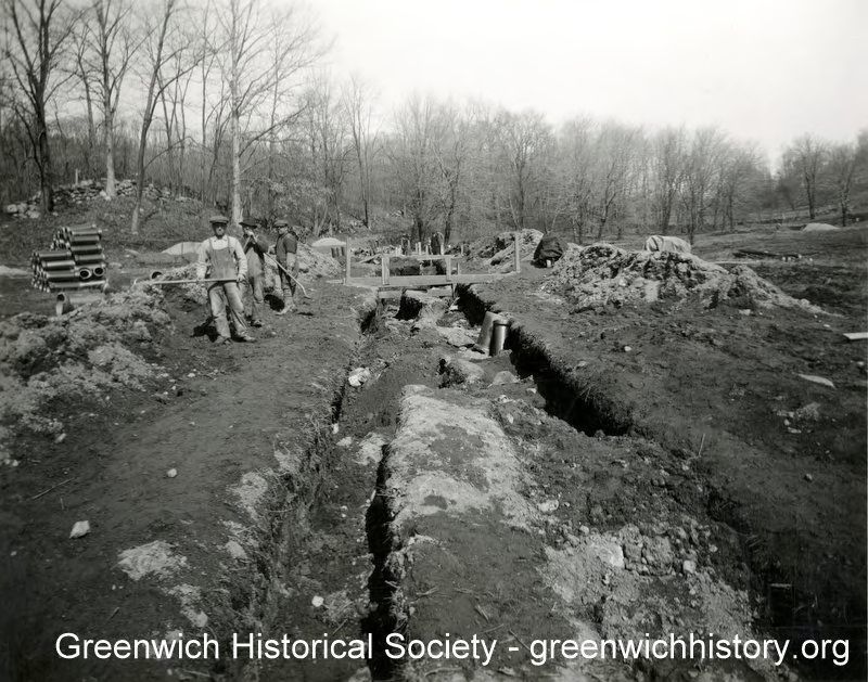 A construction site with a trench traveling through the middle of the field. Three workers stand to the left side of the trench holding shovels. Wooden planks lay across the trench and construction materials lay around the site.Collection