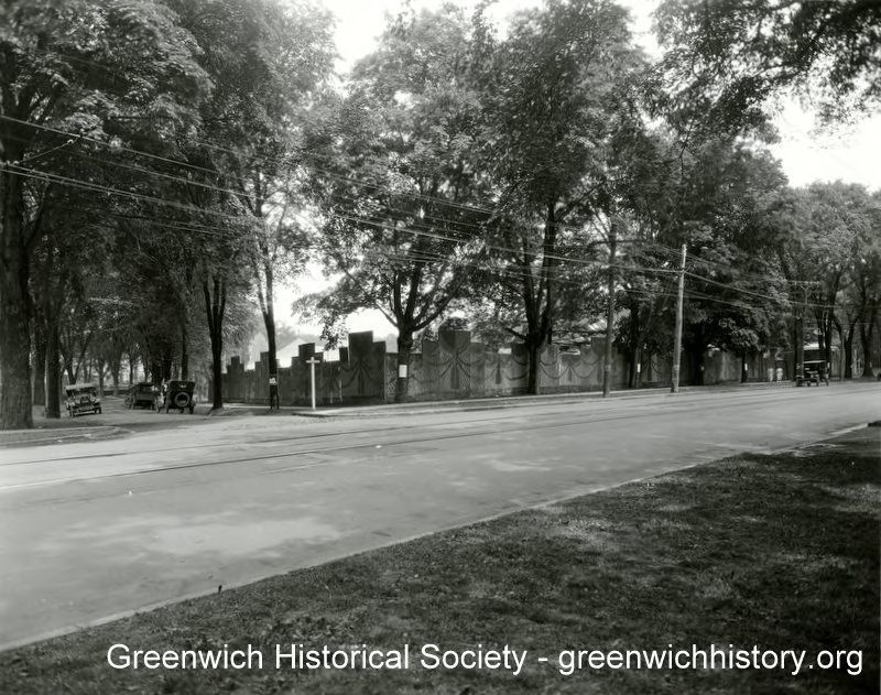 An outside perspective of the fair. There is a road just outside of the fenced in fair with Ford Model A cars parked on the street. There is a street sign on the corner and utility wires hanging above. This fair takes place at the northeast corner of East Putnam Avenue and Park Avenue.Collection