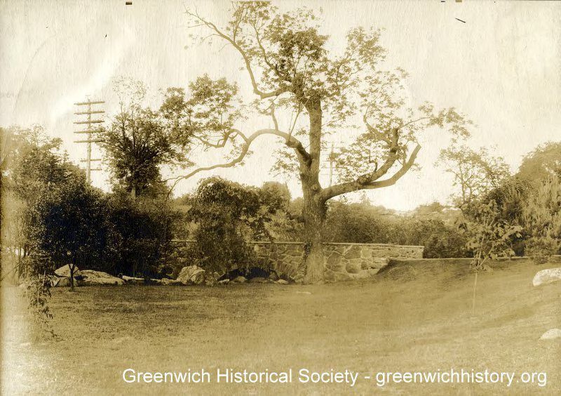 A close up view of the stone bridge over Horseneck Brook. In front of the stone bridge is a tree with three branches and some leaves. In the foreground is a telephone pole.Collection