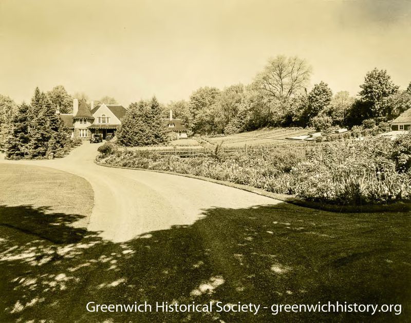 Distant view of the Carriage House. Two story home with two cars parked in the driveway. It has a conical tower and a Palladian window on the second floor, above the main entrance.Collection