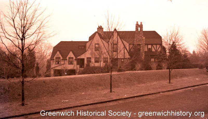 A front perspective of Smith Road. Two story home with two stone chimneys and a gambrel roof. The roof has many angles and steep pitches. The front facade is stucco with half-timbering.Collection