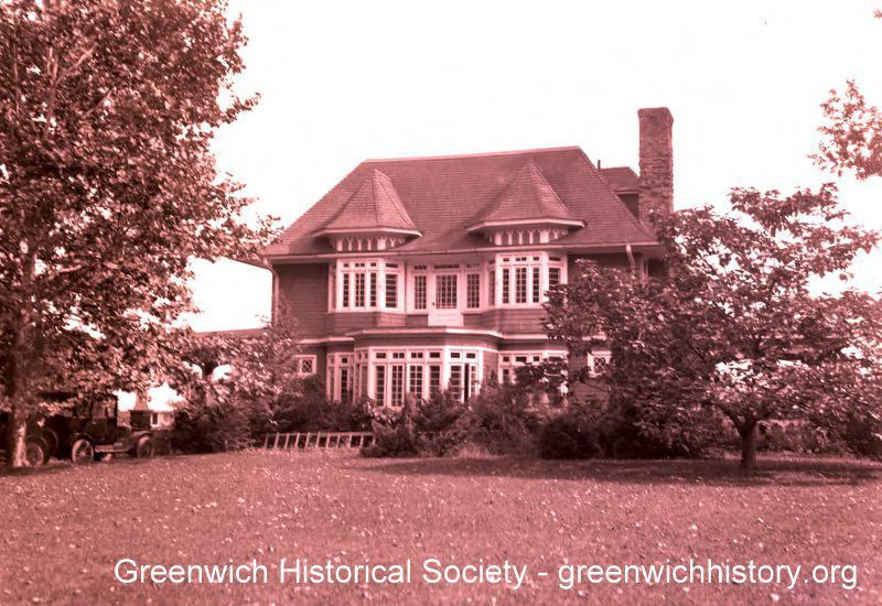 A front view of Field Point Road. Two story home with ribbon windows and a bay window on the first story. There is a ladder laying on the ground in the front yard and a Model A Ford parked in the driveway.Collection